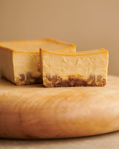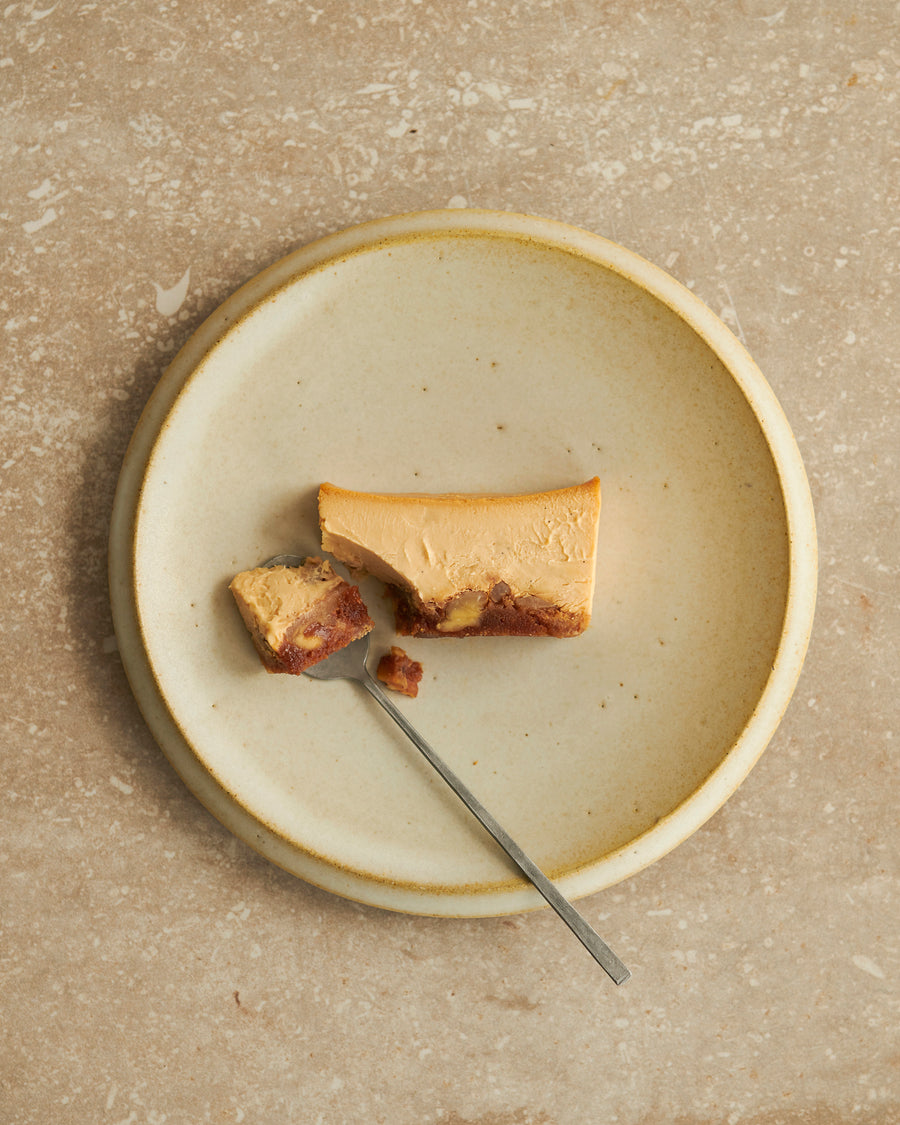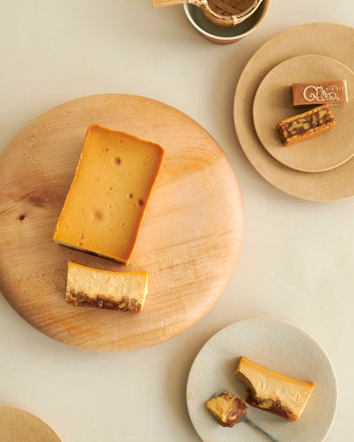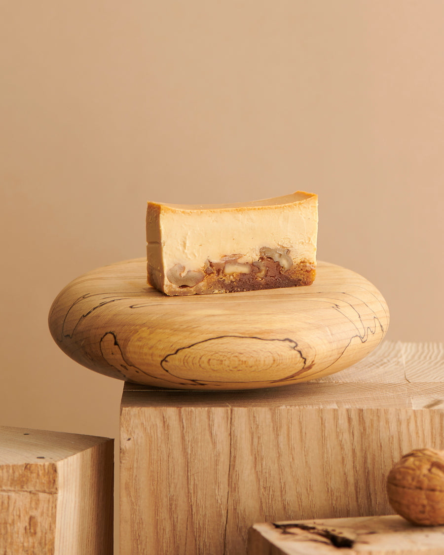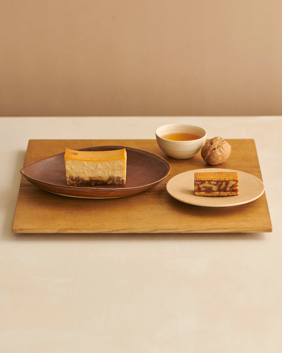 ボトム生地は、食感が残るように浅めにローストしたクルミと、ガレットブルトンヌというバターを贅沢に使用したフランス伝統のクッキーを手作りし、そこへ生キャラメルを組み合わせ、クルミッ子を彷彿とさせるような味わいに仕上げました。クルミ、クッキー、生キャラメルで全体の味わいのバランスをまとめたボトム生地に、チーズケーキの生地を流して焼き上げることで、クッキーの食感が程良くしっとりとし、ボトム生地に一体感が生まれます。