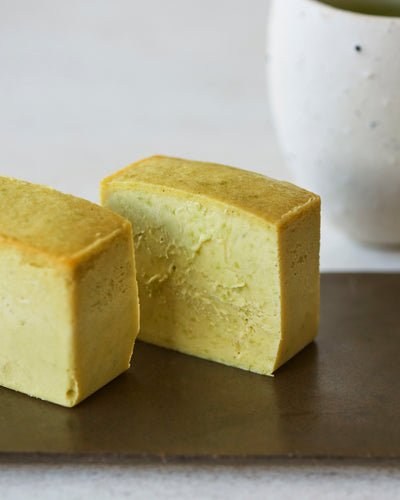 北海道産の枝豆にジャスミンライスを合わせた濃厚な味わいのずんだフレーバー。枝豆にオリーブオイルを組み合わせ、青い香りを引き立てながら、バニラやクリームチーズでチーズケーキらしい濃厚さを加えました。そこへパウダー状にしたジャスミンライスと塩を加えることで、枝豆本来の味わいと香りをより一層引き立てました。