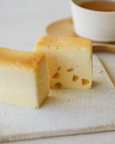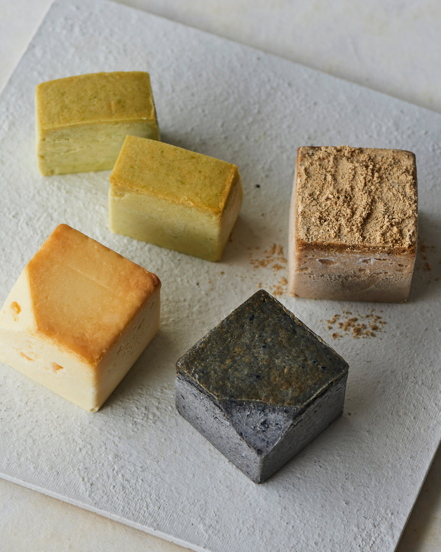 柚子の芳醇な香りと心地よい酸味を楽しめる「柚子オリーブ」、濃厚で香ばしい味わいを生かした「黒胡麻バニラ」、北海道産の枝豆にジャスミンライスを合わせた濃厚な味わいの「ずんだジャスミン」、メープルシロップの旨味ときなこの香ばしい味わいを楽しめる「きなこメープル」のキューブ型チーズケーキをオリジナルのボックスに詰めました。