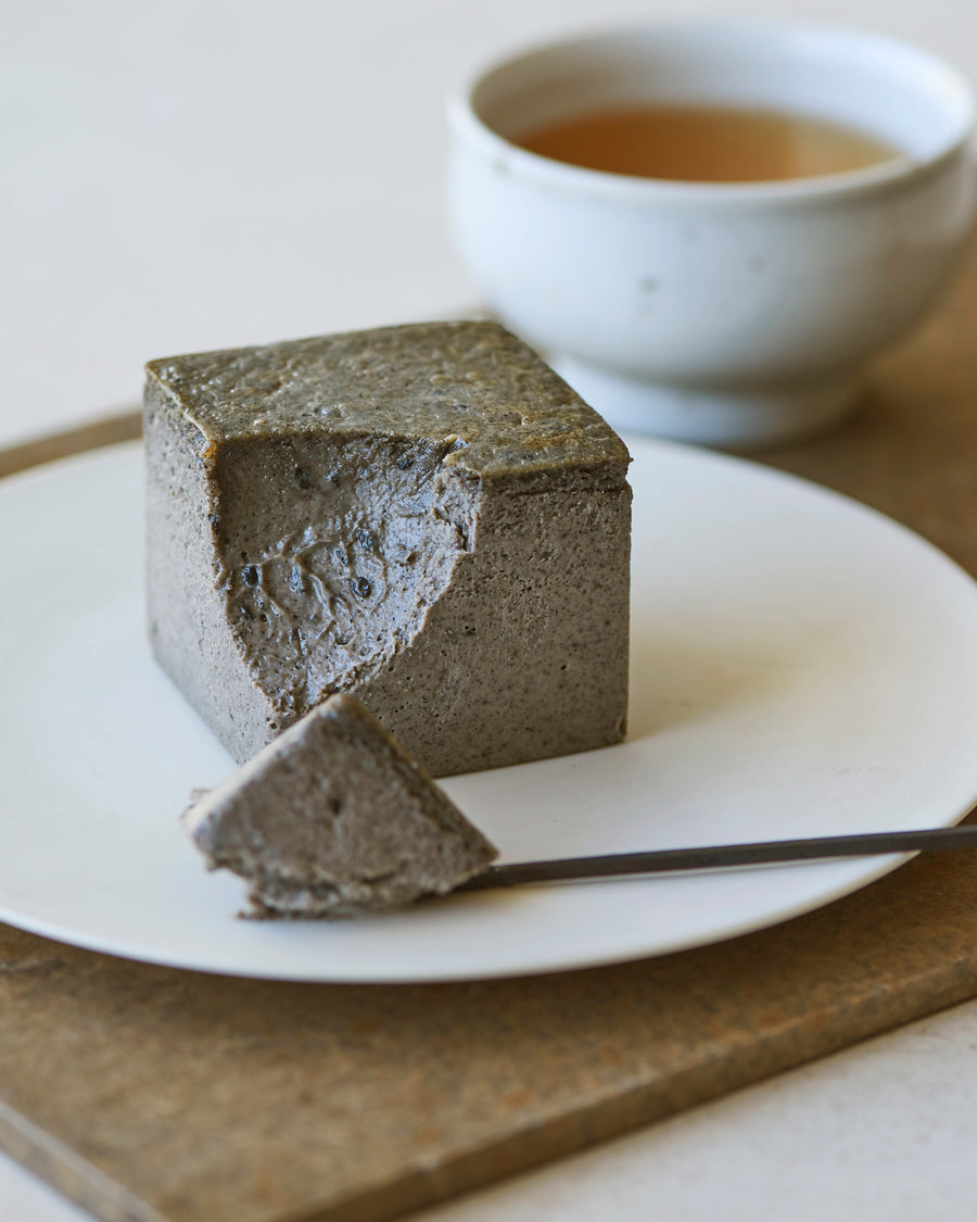 黒胡麻のペーストをふんだんに使用し、マスカルポーネと少量のバニラを加え、シンプルに仕立てました。生地の中に炒った黒胡麻を加えることで、プチプチとした食感や噛むたびに弾ける香りや味わいをお楽しみいただけます。アクセントに少量の塩を加えることで甘味に輪郭が生まれ、黒胡麻らしい旨味と濃い味わいを引き立てました。