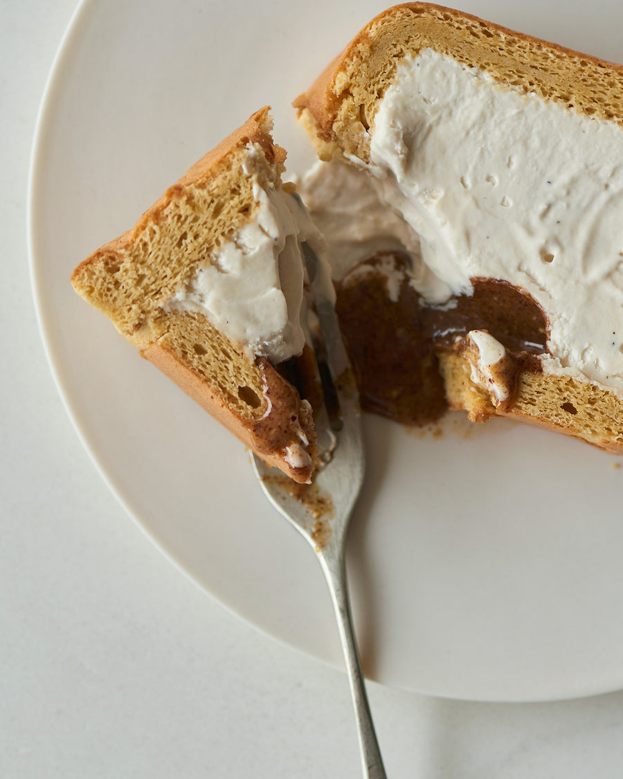 クリームは、世界遺産「武夷山」でしか生産されない貴重な中国茶の「武夷岩茶(ぶいがんちゃ)」を使用。生クリームに一晩漬け込み、ゆっくりと旨味を抽出しました。その後、丁寧に漉し、スキムミルクと砂糖を加えて泡立てることで、香ばしくも旨味のある味わいに仕上げました。シンプルな味わいに、変化と強い旨味を加えるため、ケーキの底にピーカンナッツのプラリネを忍ばせています。