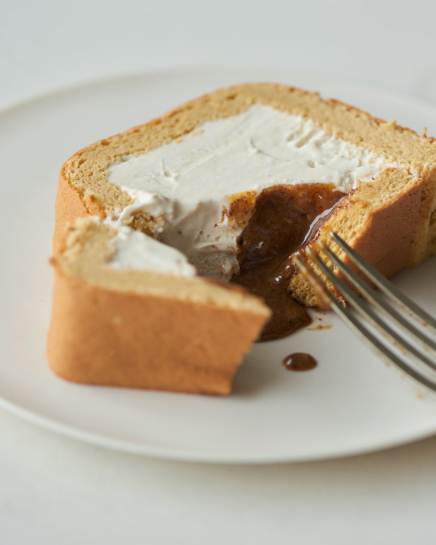 ケーキの端はカットせず、そのままお届けします。形が四角いことで、クリームをたっぷりと味わえるのがこのロールケーキの特長のひとつ。武夷岩茶の旨味が詰まったクリームを最後までお楽しみください。